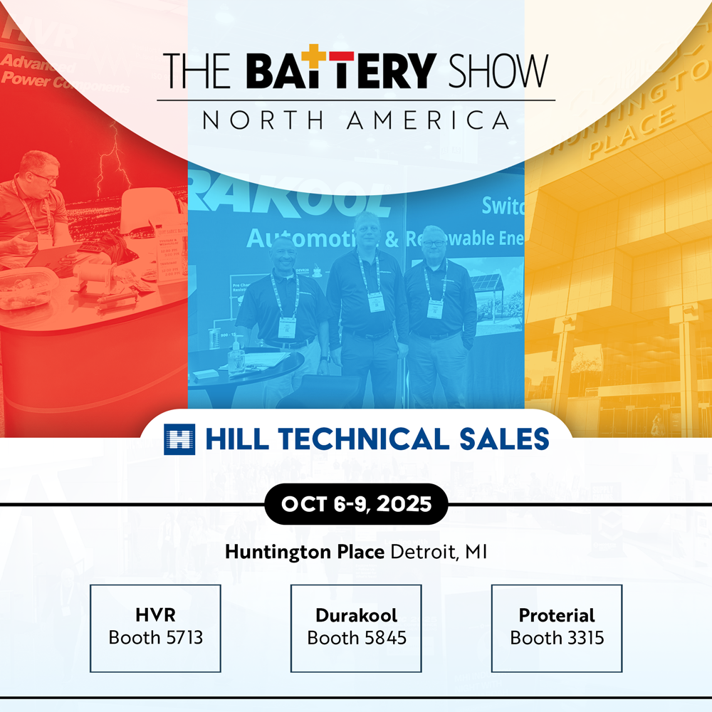 Guess who’s going to The Battery Show 2025 this year? That’s right, Hill Technical Sales will be there October 6-9 at the Huntington Place in Detroit, MI. And we’re not the only ones: HVR, Durkaool, and Proterial will be joining us!